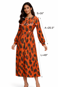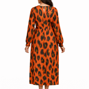 Turn heads with our Wild Leopard Print Maxi Dress. An fiery orange backdrop and bold black-brown leopard spots create a striking, fashion-forward look. This long-sleeve, flowy silhouette drapes beautifully for effortless style from day to night, with a clean round neckline and a relaxed fit that pairs perfectly with boots or heels. Easy-care fabric and a versatile length make it a standout piece for any wardrobe.